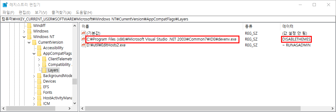 Windows 8 이상의 버전에서는 위와 같은 메뉴가 사라지는데 다음과 같이 레지스트리HKEY_CURRENT_USER\Software\Microsoft\Windows NT\CurrentVersion\AppcompatFlags\Layers에 아래 문자열 값을 추가 함으로써 해결할 수 있다.