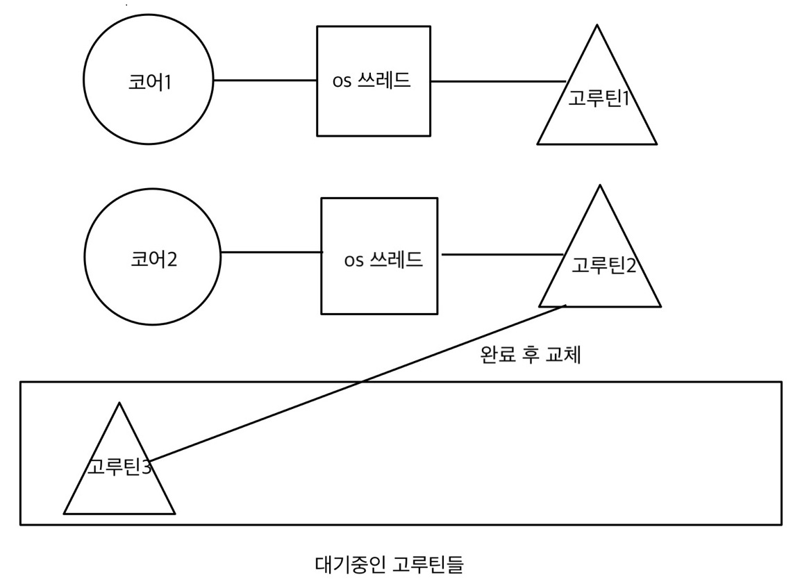 Go루틴은 명령을 수행하는 단일 흐름으로 OS 스레드를 이용하는 경량 스레드이다. Go언어는 CPU 코어, OS 스레드, 소루틴을 서로 조율하여 사용해 고루틴을 효율적으로 다룬다. 고루틴을 이용하면 코어와 스레드는 변경되지 않고 오직 고루틴만 옮겨 다니기 때문에 컨텍스트 스위칭이 일어나지 않는다.