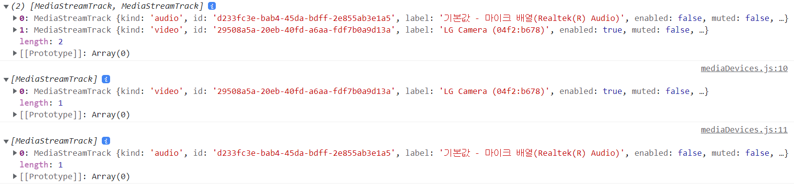 stream 객체를 가져오고 안의 트랙 정보들을 출력해 보고 .getAudioTracks() 메서드를 통해 오디오 트랙 객채들을 가져와 음소거 하였다.