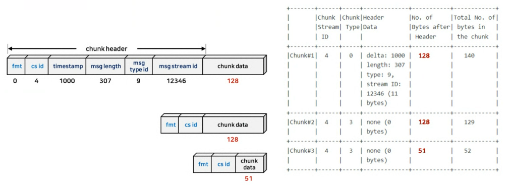 Handshake 과정 이후 데이터를 주고 받는데 이는 Chunk 단위로 fragmentation되어 보내지, 수신 단에서 다시 ressembly 되어 온전한 메시지가 된다. RTMP 연결은 multiplex 될 수 있으므로, 각각의 스트림을 구분하기 위해 chunk stream ID를 사용한다. chunk format은 다음과 같으며 각각의 요소가 가변 크기를 갖는다.