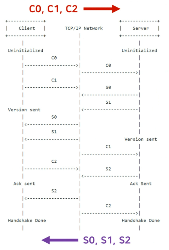 RTMP의 시작은 Handshake로 시작하는데 클라이언트는 서버로 C0, C1, C2를 보내고 서버는 클라이언트로 S0, S1, S2를 보내 서로의 정보를 확인하고 Handshake과정을 끝낸다.