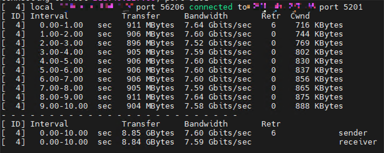 초당 전송량은 900MBytes정도며 Retr(재전송 횟수)는 평균적으로 0임을 알 수 있다. 참고로 재전송 횟수는 적을수록 안정적이다.