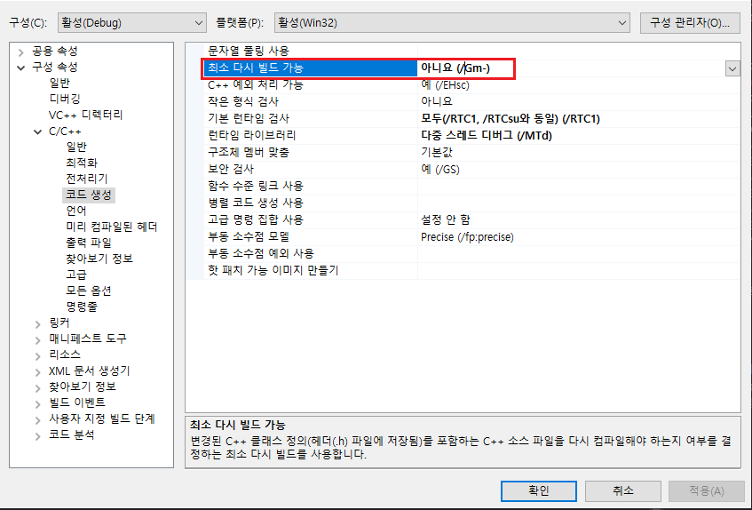 - 프로젝트 속성 -> C/C++ -> 코드 생성 -> 최소 다시 빌드 가능 : "아니요"로 설정
